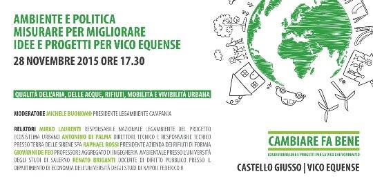 Un’occasione per riflettere sulle sfide presenti e su quelle future. Il convegno “ Misurare per migliorare. Idee e progetti per Vico Equense” del prossimo 28 novembre 2015 sarà luogo di dibattito sulla situazione ambientale generale, ma non solo. Grazie all’intervento di illustri accademici delle università di Napoli e Salerno, aria, acqua, rifiuti e trasporti verranno analizzati da più punti di vista. Un modo come un altro per studiare strategie future per Vico, partendo però da uno sguardo più ampio e universale. I temi scottanti della crisi trasporti e della gestione rifiuti saranno al centro della discussione, cui interverranno i docenti universitari proff. Giovanni De Feo (Salerno) e Renato Briganti (Napoli, Federico II). A moderare la conferenza sarà il presidente di Legambiente Campania Michele Buonomo, seguito dal responsabile nazionale di Legambiente Mirko Laurenti, peraltro coordinatore del progetto Ecosistema urbano. La sostenibilità in città e le sue tante sfaccettature vedranno protagonisti del confronto anche i cittadini, coinvolti in prima persona anche grazie alla partecipazione di Terra delle Sirene spa, con il direttore tecnico Antonino Di Palma. Interventi anche da Formia, nel basso Lazio, con il numero uno della locale azienda di gestione rifiuti Raphael Rossi.