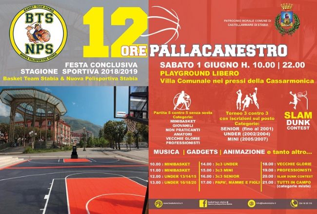 Domani grande evento a Castellammare organizzato dal Basket Team Stabia & Nuova Polisportiva Stabia: la 12 ore di pallacanestro non stop con inizio dalle ore 10:00 e fino alle ore 22:00 nei pressi della Cassa Armonica di Castellammare di Stabia dove sarà installato il campo di gioco.