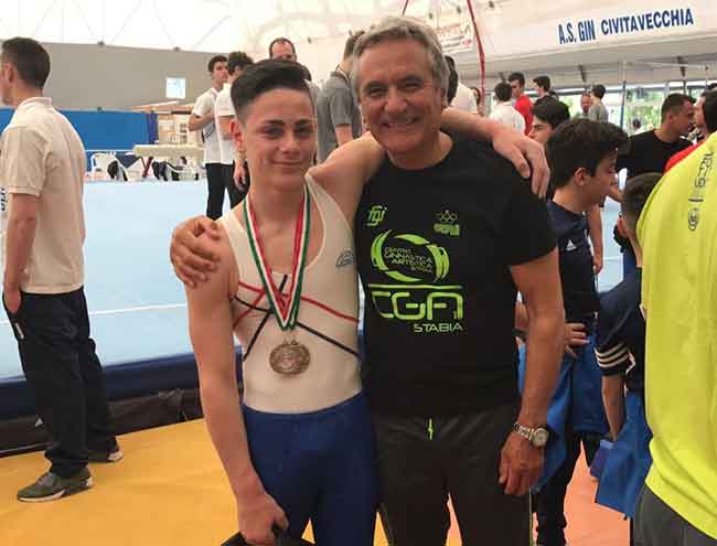 Vero e proprio exploit del C.G.A. Stabia Castellammare di Angelo Radmilovic che ha vinto due titoli italiani, un argento ed un bronzo, ai Campionati Italiani Gold di Ginnastica artistica maschili svoltisi nell’impianto sportivo “Ferrero Medici“ della S.G. Civitavecchia. Artefice del colpo grosso è stato Francesco Schettino laureatosi campione italiano agli anelli e alla sbarra junior1 (nella foto con Radmilovic, entrambi sorridenti) mentre i suoi compagni di club senior, Christian Atte e Biagio Barbato, sono saliti sul 2° e 3° gradino del podio tricolore, rispettivamente alla sbarra alle spalle di Massaro, e al corpo libero. Il sodalizio stabiese, sede del Polo Tecnico Federale maschile Centro-Sud, ha fatto registrare, poi, anche il 4° posto di Mattia Nicolao negli allievi L3.