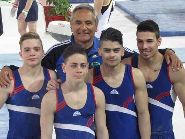Si è svolta al PalaLottomatica di Roma la 3à prova del Campionato nazionale di serie A1 e A2 di Ginnastica Artistica maschile e femminile che ha fatto registrare il nuovo record assoluto di presenze in una competizione di Ginnastica Artistica per squadre con circa 12.000 spettatori paganti. La ginnastica è tornata sul grande palcoscenico romano dopo tanti anni, quasi a voler esorcizzare le Olimpiadi del 2024 e a dimostrare il crescente interesse per questa disciplina sportiva che sta facendo registrare significativi incrementi, sia nel numero di praticanti, sia in quello degli appassionati. Impresa sfiorata dal C.G.A. Stabia Castellammare di Angelo Radmilovic che in Serie A2 ha mancato il podio per un solo decimo di punto, 195,35 contro i 195,45 dei padroni di casa della Ginnastica Romana, davvero una inezia pari allo 0,05 % del punteggio totale. Giancarlo Polini, apparso in forma smagliante, con uno straordinario personale complessivo di punti 81,90, Christian Atte, Biagio Barbato e Francesco Schettino (tutti nella foto con Angelo Radmilovic) sono stati in zona medaglia sino all’ultimo esercizio dimostrando tutto il loro valore di fronte al pubblico delle grandi occasioni che, ovviamente, ha sostenuto i propri beniamini saliti sul 3° gradino del podio proprio al fotofinish.