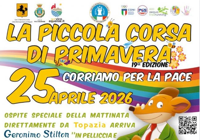 Si parte sabato 25 aprile con la 19ª edizione della Piccola Corsa di Primavera, dedicata al tema “Corriamo per la Pace”: una manifestazione rivolta a bambini e ragazzi, con gare su diverse distanze, momenti educativi e la partecipazione del personaggio Geronimo Stilton, che consegnerà un libro sulla pace a tutti i partecipanti. Nel pomeriggio sono previste le premiazioni e attività dedicate all’inclusione sportiva.