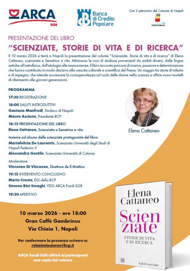 La Banca di Credito Popolare e ARCA Fondi SGR, con il patrocinio del Comune di Napoli, ospiteranno, nello storico Gran Caffè Gambrinus di Via Chiaia, la presentazione del libro “Scienziate, storie di vita e di ricerca” della scienziata e Senatrice a vita Elena Cattaneo, il prossimo martedì 10 marzo, alle ore 18:00. L’iniziativa è in calendario a pochi giorni della festa internazionale della donna.