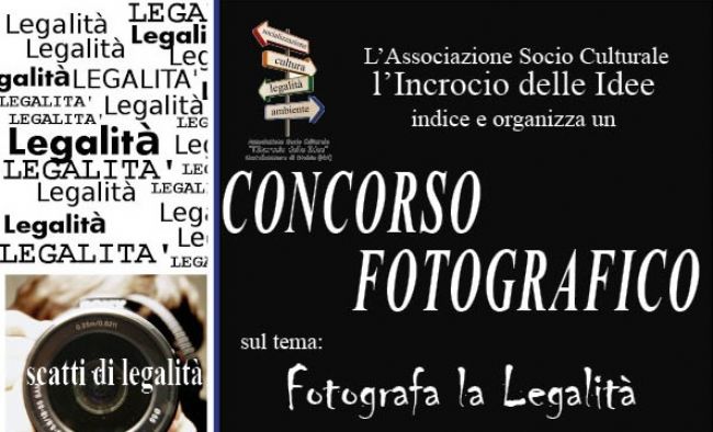 L’associazione Socio Culturale ODV indice e organizza un Concorso fotografico sul tema: “Fotografa la legalità”. Com’è noto l’associazione ha dedicato l’anno in corso alla Legalità e molte delle sue iniziative richiamano e affrontano questa tema che sta mortificando prepotentemente la comunità tutta. Così come riportiamo sulla locandina e nel bando, “Un concorso fotografico per affrontare il tema legalità attraverso un hobby, un’occasione per riflettere sull’argomento ed evidenziare e riconoscere le tante forme di legalità che pure sono presenti e che vanno appunto fissate per moltiplicarle e dunque contribuire a contrastare le illegalità, le varie forme di violenze, le prepotenze, le arroganze, le ingiustizie. Legalità, intesa nel senso più ampio del suo significato, come strumento (fine) atto ad alimentare valori quali il rispetto, la libertà e la solidarietà e di evitare abusi di potere. Perché solo in una società in cui è presente il rispetto delle regole è possibile avvertire i valori fondanti per una convivenza civile. Attraverso la fotografia un punto di vista personale che aiuti a riflettere sulla non ovvietà dei meccanismi che è possibile ritrovare dietro l’adesione al concetto di legalità. (compiere una determinata azione non perché ovvia, ma perché fondata sul rispetto delle regole)”.