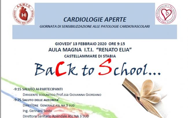 Anche quest’anno l’U.O.C. di Cardiologia e U.T.I.C. dell'Ospedale San Leonardo di Castellammare di Stabia, diretta dal dott. Raffaele Longobardi, ha organizzato nell’ambito dell’iniziativa nazionale, l’evento “Cardiologie Aperte”, dal titolo “Back to School”.