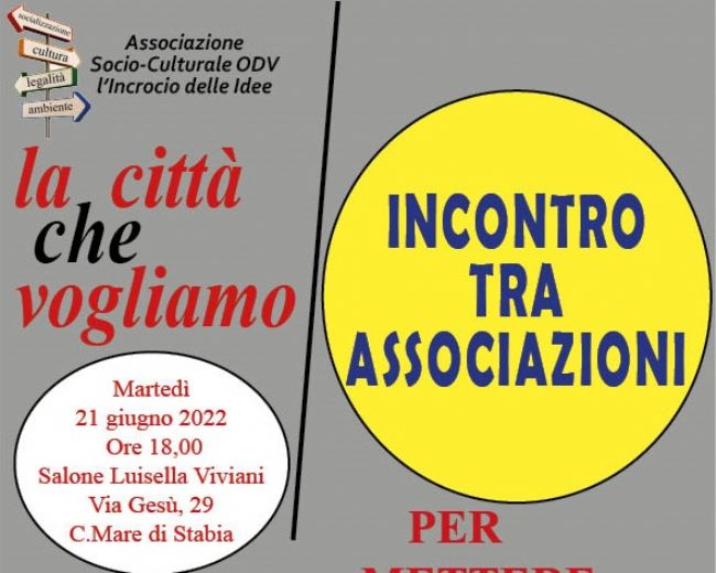 L’Associazione Socio Culturale ODV l’Incrocio delle Idee, ha organizzato per martedì 21 giugno prossimo, presso il salone Luisella Viviani in via Gesù, 29, con inizio ore 18, una pubblica iniziativa sul tema “La città che vogliamo”. Incontro per mettere in campo proposte attuabili, progetti, idee, pensieri ed essere propedeutico a riflessioni più circoscritte per un tema che intende coinvolgere, sia pure in fasi successive, l’intera comunità. Sono state invitate a partecipare alcune associazioni che operano sul territorio, tante altre sicuramente ci sono, ma molteplici saranno le opportunità affinché il mondo associativo nella sua complessità possa essere protagonista della rinascita e ricostruzione della comunità con l’obiettivo, non secondario, di rimuovere “contenitori”, nati per altre finalità e destinati a rimanere vuoti. Hanno aderito e prenderanno la parola le associazioni Alegria, Achille Basile - Le ali della lettura, Casa della Pace e della non violenza, Gli amici della Filangieri, Carmine Onlus, Città Viva, l’Incrocio delle Idee, Stabia Amore e Stabiesi Post Fata Resurgo.