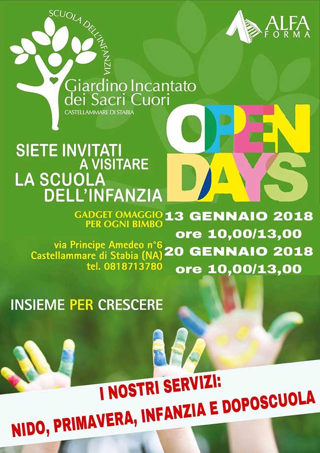 Open days sabato 13 gennaio e sabato 20 gennaio alla scuola dell’infanzia il “Giardino incantato dei Sacri Cuori” sita alla via Principe Amedeo 6 a Castellammare di Stabia.