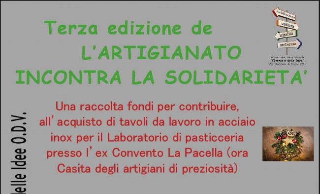Per il terzo anno consecutivo “L’artigianato incontra la solidarietà”attraverso l’apertura della Bottega della solidarietà. Bottega ubicata in corso Vittorio Emanuele II, 20, dove saranno messi in mostra manufatti realizzati da soci e da amiche e amici dell’associazione "Incrocio delle idee" per una raccolta fondi proveniente dai contributi che vorranno offrire i cittadini e che saranno finalizzati all’acquisto di tavoli di lavoro in acciaio inox per il laboratorio di pasticceria presso l’ex convento La Pacella, ora “Casita degli artigiani di preziosità”. Manufatti realizzati attraverso un laboratorio diffuso e dunque volontarie e volontari che all’interno delle loro abitazioni o nella sede dell’associazione si sono attivati per realizzarli esprimendo la loro creatività, socializzando e comunque contribuendo concretamente alla finalità di solidarietà.