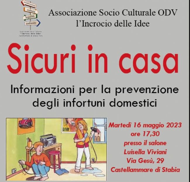 Organizzata dall’Associazione Socio Culturale ODV l’Incrocio delle Idee, si terrà il 16 maggio 2023 una pubblica iniziativa sul tema: “Sicuri in casa” – Informazioni per la prevenzione degli infortuni domestici. Incidenti che accadono in un luogo che si ritiene sicuro in assoluto mentre, l’Istat ci dice che, gli infortuni tra le mura domestiche sono addirittura più di quelli sul lavoro.Un’iniziativa utile che si rivolge a tutte le fasce di età e che sono la prima causa di morte per i bambini. Le informazioni saranno fornite dall’Ing, Antonio Fabbrocino – Esperto in sicurezza antinfortunistica e si terrà presso il Salone Luisella Viviani in via Gesù, 29 con inizio ore 17.30.