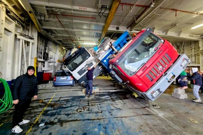Due camion che erano nella stiva e trasportavano materiale edile si sono inclinati spezzando le catene di fissaggio.