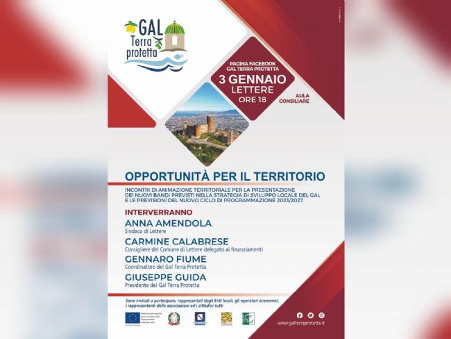 L’evento si terrà alle ore 18 presso l’aula consiliare del Comune di Lettere sarà fruibile anche sulla pagina Facebook del Gal Terra protetta. Interverranno: Giuseppe Guida, presidente del Gal; Gennaro Fiume, coordinatore del Gal; Anna Amendola, sindaco di Lettere; Carmine Calabrese, consigliere del Comune di Lettere delegato ai finanziamenti. Sono invitati a partecipare rappresentanti degli Enti locali, operatori economici e rappresentanti delle associazioni nonché i cittadini tutti.