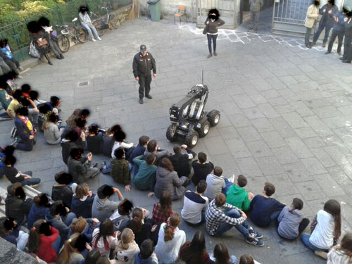 Gli artificieri antisabotaggio dell’arma hanno preparato un banchetto con tutti i tipi di botti illegali, dai rendini alle cipolle e alle bombe carta ancora piu’ grosse. Hanno spiegato perche’ i fuochi preparati artigianalmente sono molto pericolosi e hanno anche ben evidenziato quali gravissimi conseguenze puo’ causare l’uso di quel tipo di fuochi. Infine, gli artificieri hanno esibito all’opera il robottino usato per disinnescare gli ordigni.