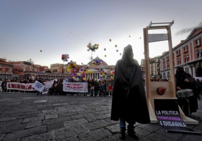 Torna la ghigliottina in piazza a Napoli dove a cadere, per finta, sotto la lama del boia sono i disabili abbandonati e di fatto condannati, come denunciano gli organizzatori della manifestazione, alla pena capitale Alle finte esecuzioni, davanti alla prefettura in piazza del Plebiscito, hanno partecipato numerose persone che hanno accolto l'invito dell'associazione a sostegno dei disabili 'Tutti a scuola' e delle numerose organizzazioni del terzo settore messo in ginocchio negli ultimi anni da una politica che - hanno spiegato - "ha dimenticato i disabili".
