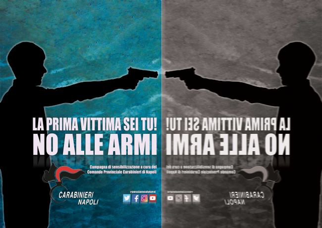 Il Generale Enrico Scandone, Comandante Provinciale dei Carabinieri di Napoli, sull’iniziativa: “Quello delle armi tra i giovani è un tema che non abbandona mai l’agenda dei Carabinieri. L’attenzione è sempre alta e la stretta sinergia con Autorità Giudiziaria, Prefettura e con le altre forze di polizia genera sempre più consapevolezza sul problema. Con questo poster abbiamo voluto parlare la lingua delle immagini, per arrivare diretti ai ragazzi. E in questa immagine ho voluto che fosse latente quel senso di insicurezza che sollevano quelle mani armate. Una sagoma scura senza personalità che si scontra con un riflesso sfocato, con una lettura distorta di un gesto che porta solo guai. Abbiamo cercato di attribuire a quella figura un senso di insicurezza che si maschera di spavalderia.Vogliamo lanciare un messaggio chiaro ma spietato. Se premi il grilletto, se tiri una coltellata lo fai mirando prima a te stesso. La prima vittima sei tu che armi la tua mano.”