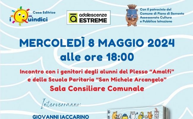 Il Comune di Piano di Sorrento, l'Istituto comprensivo Piano di Sorrento e la Scuola paritaria San Michele insieme per contrastare bullismo e cyberbullismo: domani, mercoledì 8 maggio alle ore 18.00 presso la sala consiliare della Casa comunale si parlerà dell'argomento con i genitori, partendo dallo spunto della pubblicazione “Avanti tutta! Navigare nel grande mare di internet senza restare impigliati nella Rete!” della casa editrice I Nuovi Quindici, realizzata per sensibilizzare i più giovani ad un uso responsabile delle nuove tecnologie e già distribuita gratuitamente alle scuole primarie e secondarie di primo grado.