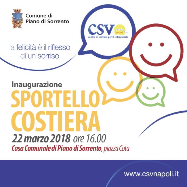 Si terrà giovedì 22 marzo, alle ore 16, nella Casa Comunale di Piano di Sorrento (Piazza Cota), l’inaugurazione del nuovo sportello Costiera del Centro Servizi per il Volontariato Napoli.