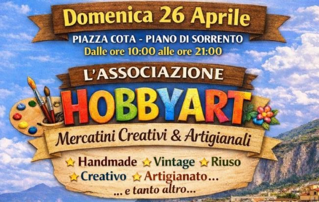 Il Comune di Piano di Sorrento è lieto di invitare cittadini e visitatori alla manifestazione HobbyArt, dedicata alla creatività e all’artigianato locale. Domenica 26 aprile, in Piazza Cota, dalle ore 10:00 alle ore 21:00, una giornata all’insegna dell’arte, della manualità e dell’ingegno, con esposizioni di: Handmade, Vintage, Riuso creativo, Artigianato.
