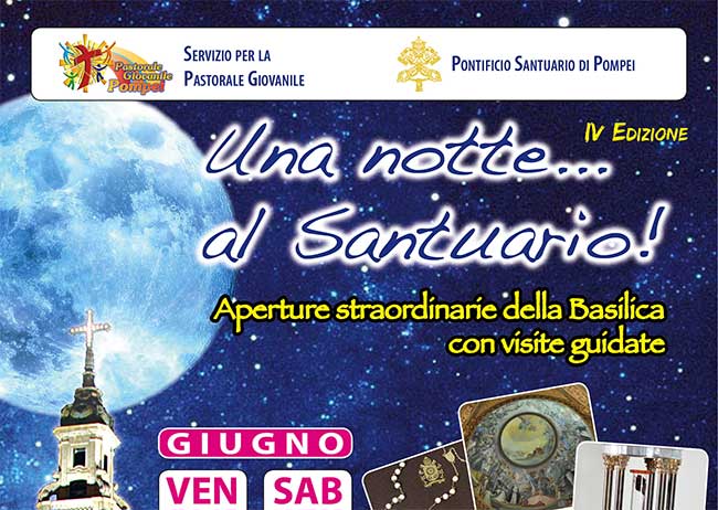 Il 17 e il 18 giugno e, poi, il 15 e il 16 luglio, il Santuario di Pompei torna ad aprirsi di notte grazie alla quarta edizione de “Una notte…al Santuario!”. Organizzata dal Servizio per la Pastorale Giovanile, l’iniziativa prevede visite guidate notturne dello straordinario e affascinante luogo di culto fondato dal Beato Bartolo Longo alla fine dell’Ottocento.