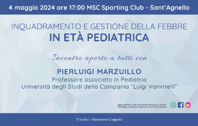 «Diamo il via a questi incontri in chiave divulgativa con l’intento di avvicinare tutte le fasce della popolazione a temi importanti relativi a prevenzione, patologie e percorsi medico-sanitari - spiega il Sindaco del Comune Sant’Agnello Antonino Coppola - Iniziamo sabato con il prof. Pierluigi Marzuillo, nostro concittadino, che ringrazio per aver aderito con entusiasmo all’iniziativa, per approfondire insieme un argomento particolarmente sentito tra le famiglie e per fornire strumenti e nozioni utili ad inquadrare e gestire al meglio gli episodi febbrili dei nostri piccoli».