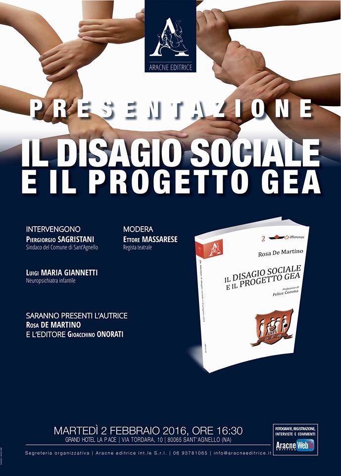 “Il concetto di disagio è, per sua natura, di matrice sociale e va interpretato a seconda delle situazioni che si vengono a verificare, influenzate dalle condizioni economiche, dalle risorse culturali e dall'ambiente sociale di riferimento” è quanto affermato da Rosa De Martino - autrice del libro Il disagio sociale e il progetto Gea (Aracne edit.). Un titolo che racchiude in sé il tema centrale del dibattito del prossimo 2 febbraio 2016 presso il Grand Hotel La Pace di Sant’Agnello. Grande attenzione verso un argomento di stretta attualità anche da parte del sindaco della cittadina costiera dott. Piergiorgio Sagristani. Il primo cittadino santanellese, nonché pediatra fra i più stimati nella zona, parteciperà al confronto del 2 febbraio durante il quale interverranno anche professionisti in materia di psichiatria infantile e pedagogia, come Luigi Maria Giannetti (neuropsichiatra). La presentazione del volume sarà inoltre accompagnata da Gioacchino Onorati (Aracne Editori). L’evento è parte di un percorso avviato dalla dott.ssa De Martino proprio nella splendida cornice di Sant’Agnello, con l’aspirazione futura di fornire risposte concrete e rimedi di carattere medico-pedagogico al fenomeno della marginalità dei soggetti disabili. Il progetto G.E.A., appunto, propone la promozione e il sostegno della ricerca scientifica e delle iniziative culturali, miranti allo studio della personalità e dello sviluppo emotivo degli individui e la possibilità di fornire al cittadino un ampio sistema di servizi integrati grazie a convenzioni e contatti con esperti professionali. “E’ nel delicato equilibrio tra assistenza al singolo, supporto alle famiglie e analisi delle risorse e dei vincoli offerti dal territorio che si articolano le competenze dell'educatore professionale” continua Rosa De Martino (cit.). Il progetto si inserisce nella più ampia esperienza dell’Associazione Disabili Penisola Sorrentina. L’associazione nasce con lo scopo di perseguire il benessere delle persone disabili, l'integrazione degli stessi all'interno della società ed il miglioramento della qualità della loro vita, attraverso la realizzazione di numerose attività quali la creazione di laboratori teatrali, musicali, sportivi, informatici, al fine di favorire l'integrazione con gli individui normodotati. Appuntamento dunque a martedi 2 febbraio ore 16,30 a Sant’Agnello, sala conferenze del Grand Hotel La Pace.