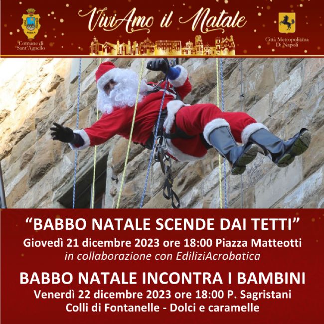Babbo Natale arriva a Sant’Agnello il 21 e il 22 dicembre 2023. Due momenti di festa dedicati in modo speciale ai più piccoli, il primo dei quali in collaborazione con EdiliziAcrobatica, nell’ambito del cartellone di eventi “ViviAmo il Natale” del Comune di Sant’Agnello, con il patrocinio della Città Metropolitana di Napoli.