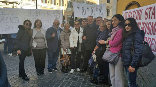 In piazza, a Montecitorio, tanti sindacalisti e lavoratori. Dalla penisola sorrentina a bordo di quattro pullman, sono giunti nella Capitale numerosi addetti al settore turistico, guidati dal presidente dell’Associazione Chiavi d’Oro, Mauro Di Maio.