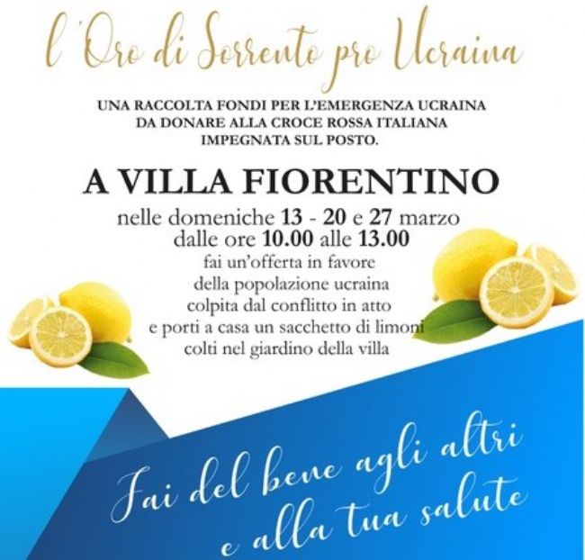 La Fondazione Sorrento scende in campo per l’emergenza ucraina. A Villa Fiorentino, durante le prossime tre domeniche, saranno distribuiti sacchetti di limoni raccolti nel giardino che circonda la splendida dimora affacciata sul corso Italia. Quanti raggiungeranno la sede della Fondazione per ritirare i tipici agrumi sorrentini avranno modo di lasciare un’offerta libera.