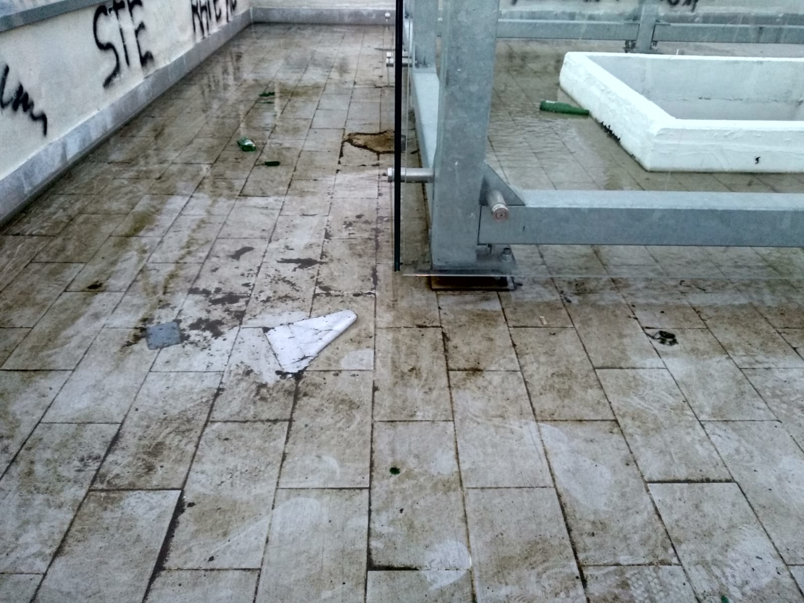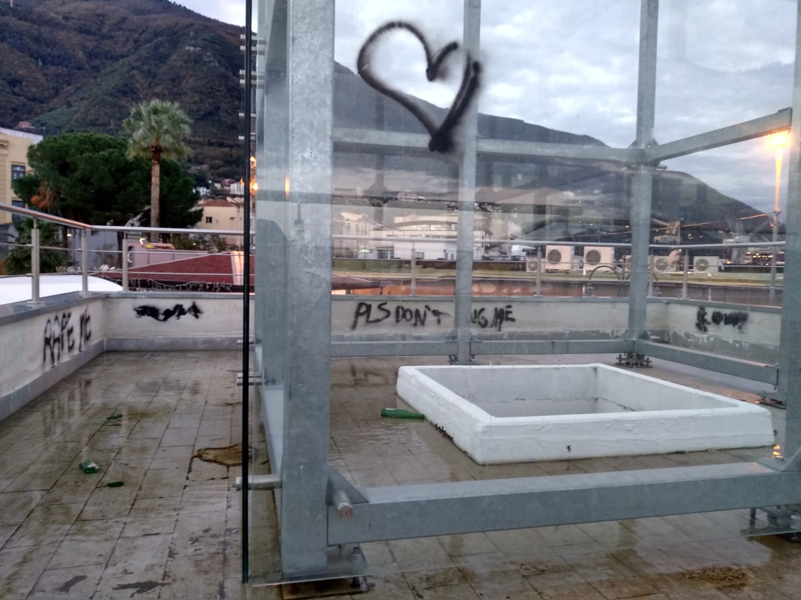 Nella notte, infatti, è stata imbrattata anche la torre in vetro della struttura, oltre che le pareti interni.
